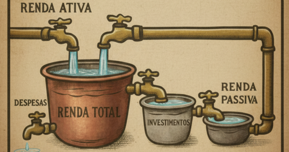 Todo o dinheiro que entra, seja de renda ativa ou passiva, se acumula nesse “balde” chamado renda total. A partir daqui, o dinheiro é distribuído para dois caminhos: